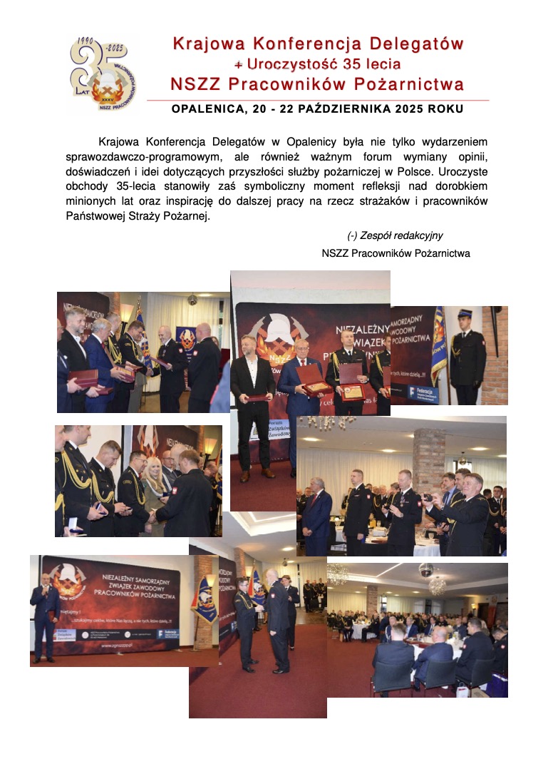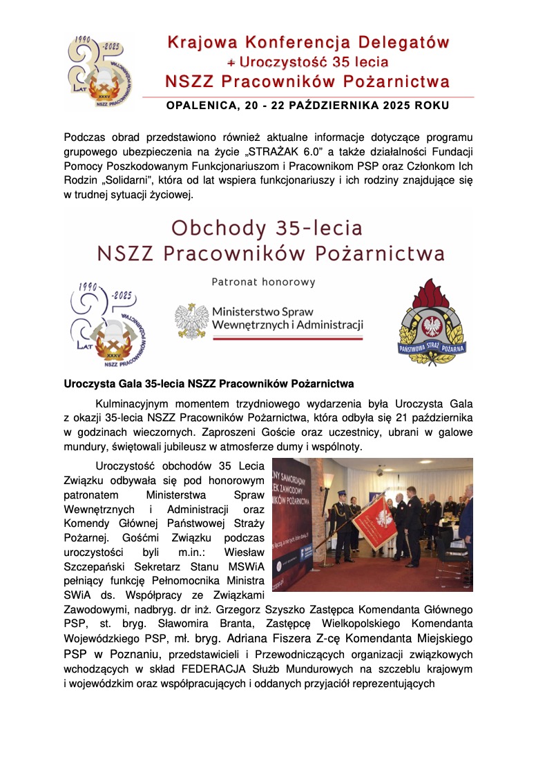 20/22 - 10 - 2025 - Komunikat z obchodów Krajowej Konferencji Delegatów NSZZ Pracowników Pożarnictwa - Opalenica 2025