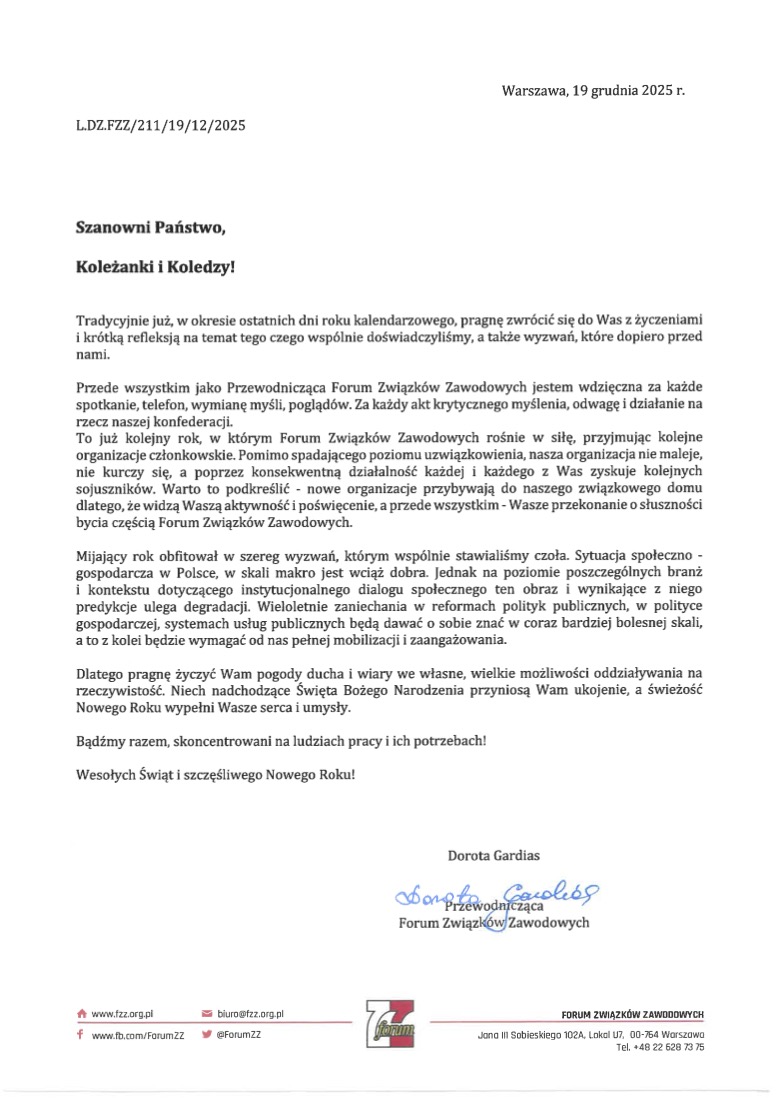 19 - 12 - 2025 - Życzenia świąteczno-noworoczne od Przewodniczącej Forum Związków Zawodowych (...)