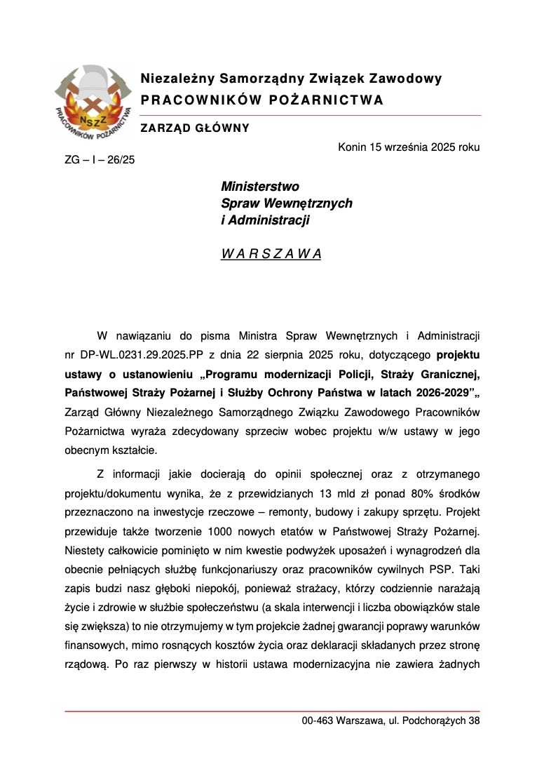 15 - 09 - 2025 - Stanowisko NSZZ PP do projektu ustawy o ustanowieniu "Programu modernizacji Policji, Straży Granicznej, Państwowej Straży Pożarnej i Służby Ochrony Państwa w latach 2026-2029" (...)