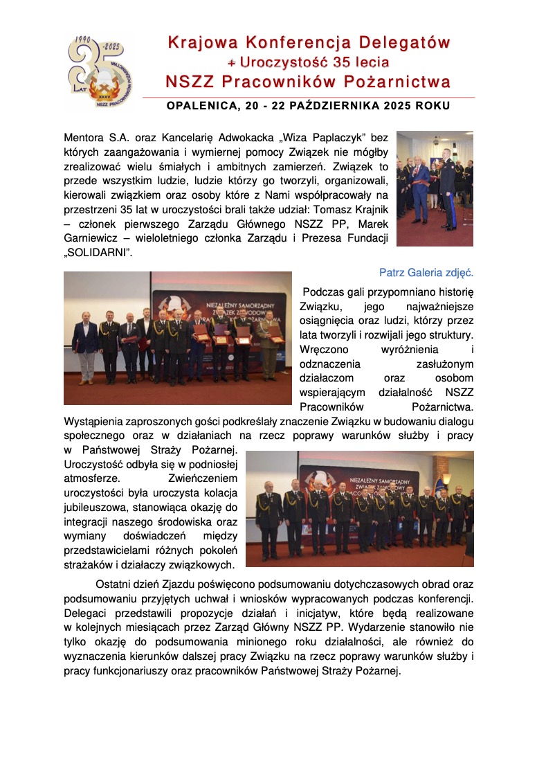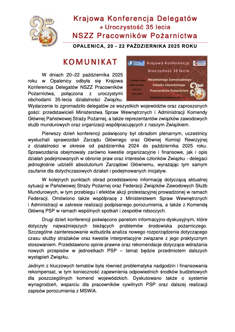 20/22 - 10 - 2025 - Komunikat z obchodów Krajowej Konferencji Delegatów NSZZ Pracowników Pożarnictwa - Opalenica 2025
