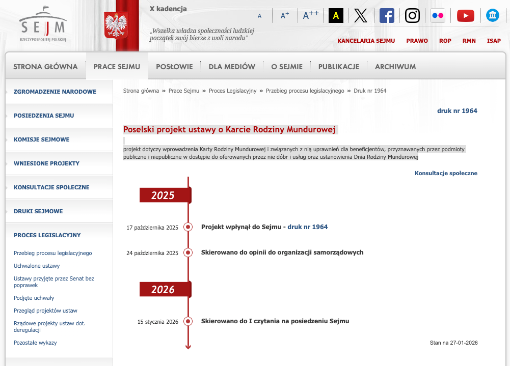 27 - 01 - 2026 -Poselski projekt ustawy o Karcie Rodziny Mundurowej (...)projekt dotyczy wprowadzenia Karty Rodziny Mundurowej i związanych z nią uprawnień dla beneficjentów, przyznawanych przez podmioty publiczne i niepubliczne w dostępie do oferowanych przez nie dóbr i usług oraz ustanowienia Dnia Rodziny Mundurowej.